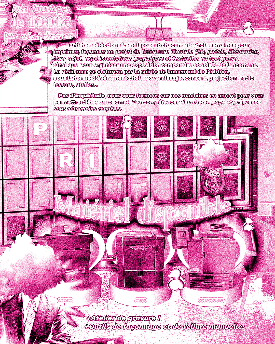 ⚡️ Les artistes séléctionné·es disposent chacun·e de 3 semaines pour imprimer et façonner un projet de littérature illustrée ainsi que pour organiser une exposition temporaire & une soirée de lancement.