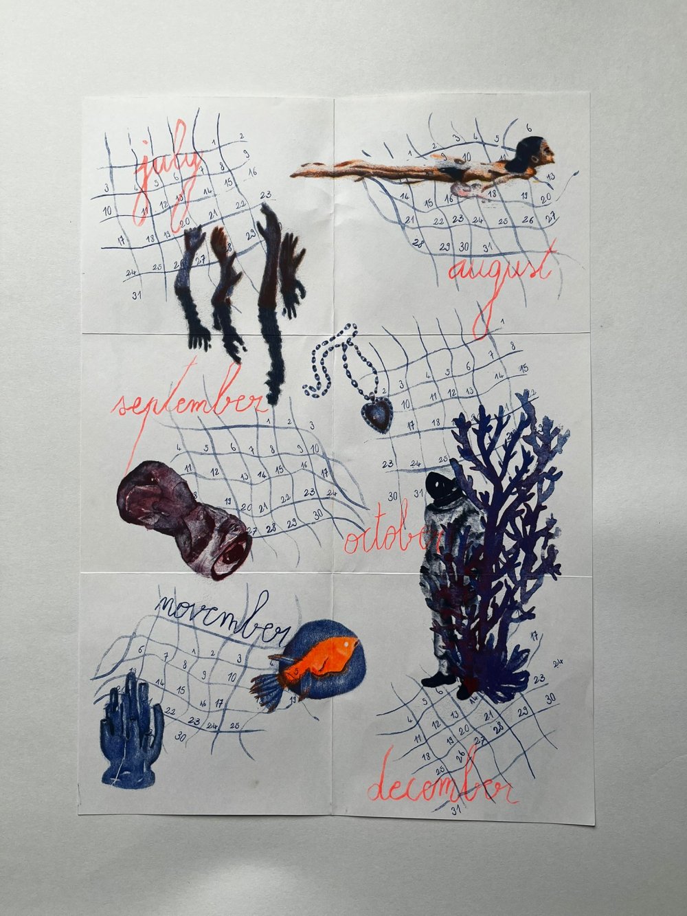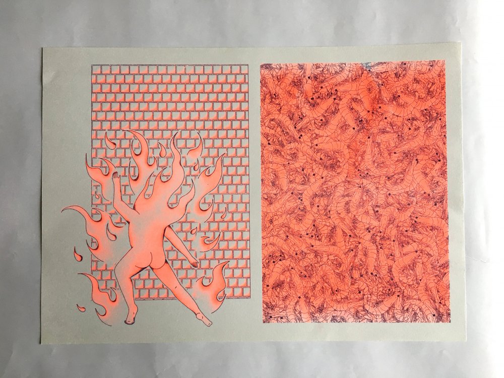 Fanzine de poésie et d'illustrations, format A5, riso 3 couleurs noir, rose, violet.