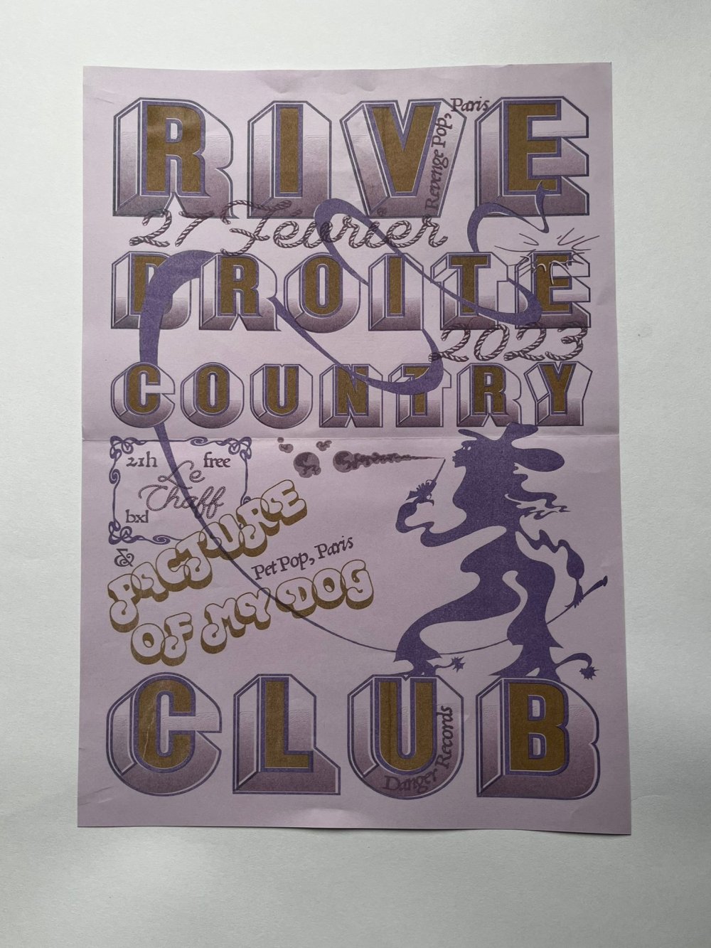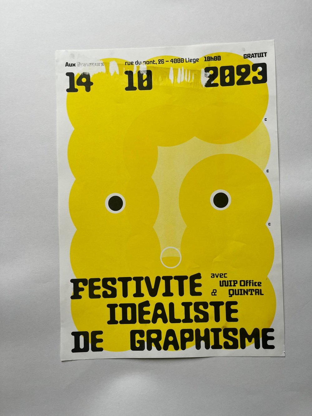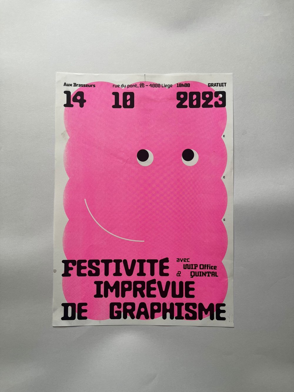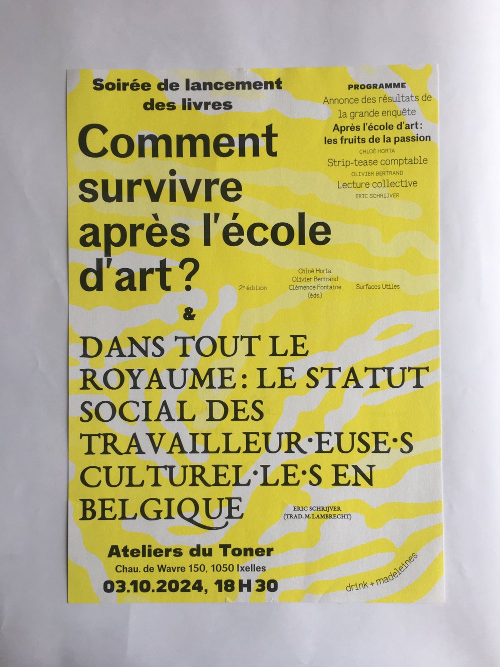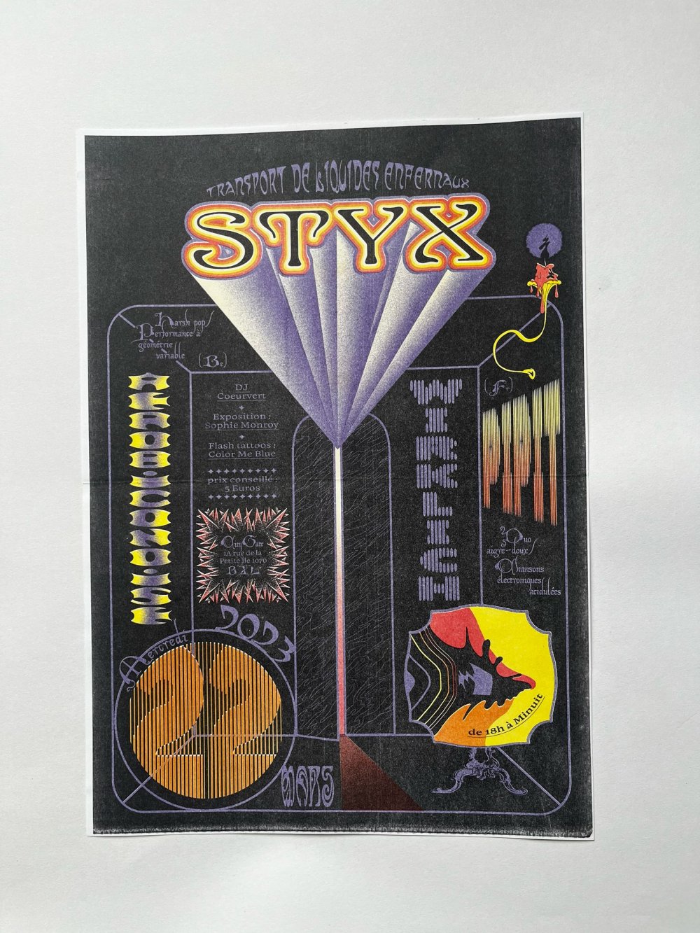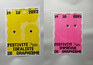 Affiche riso A3, trichromie jaune, rose fluo, jaune.