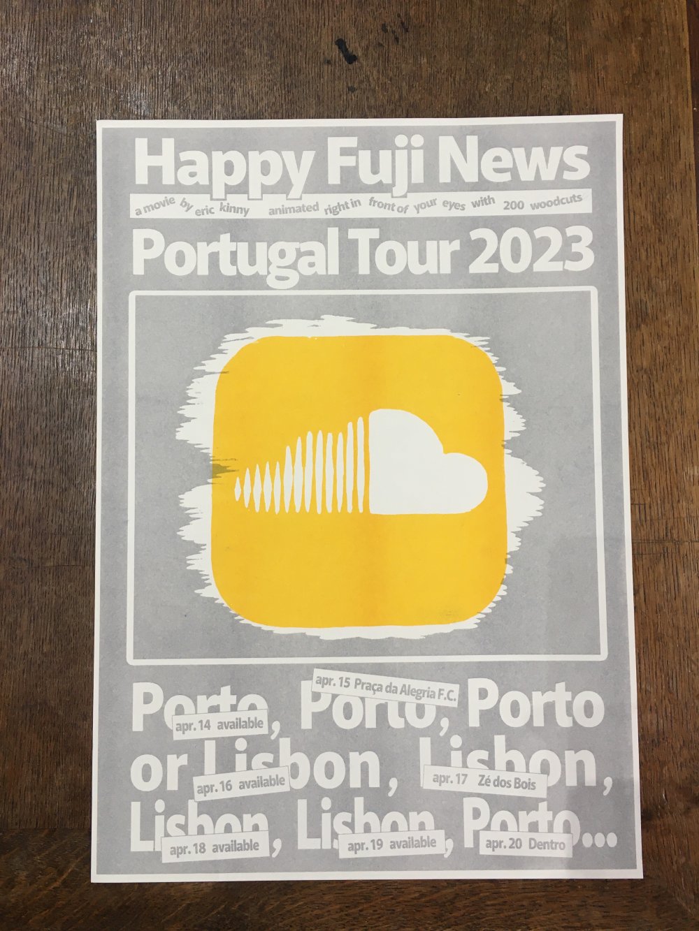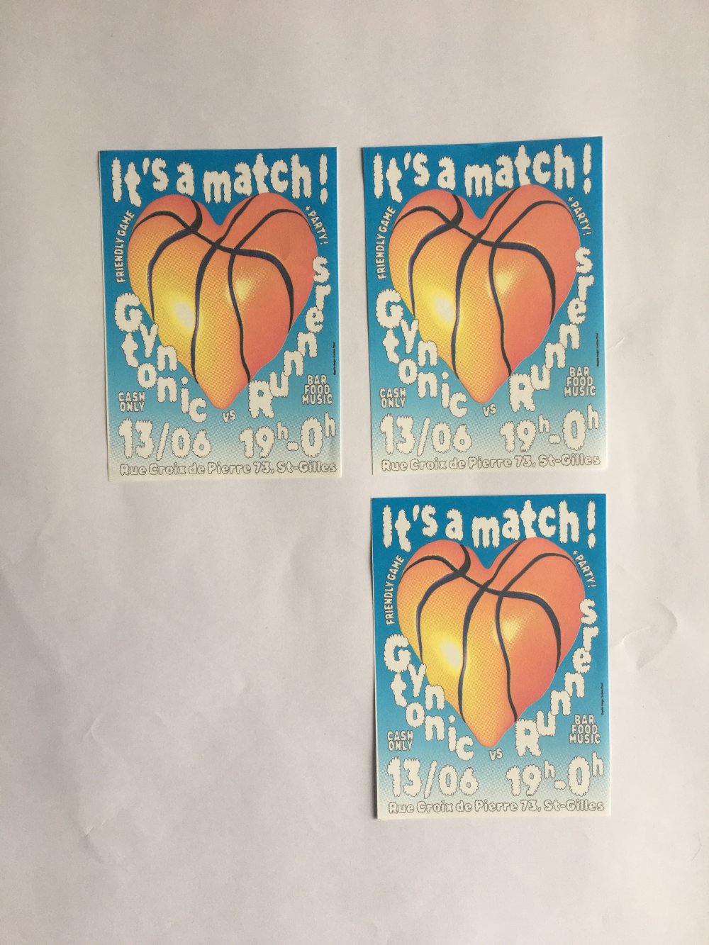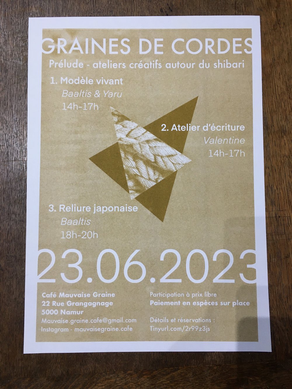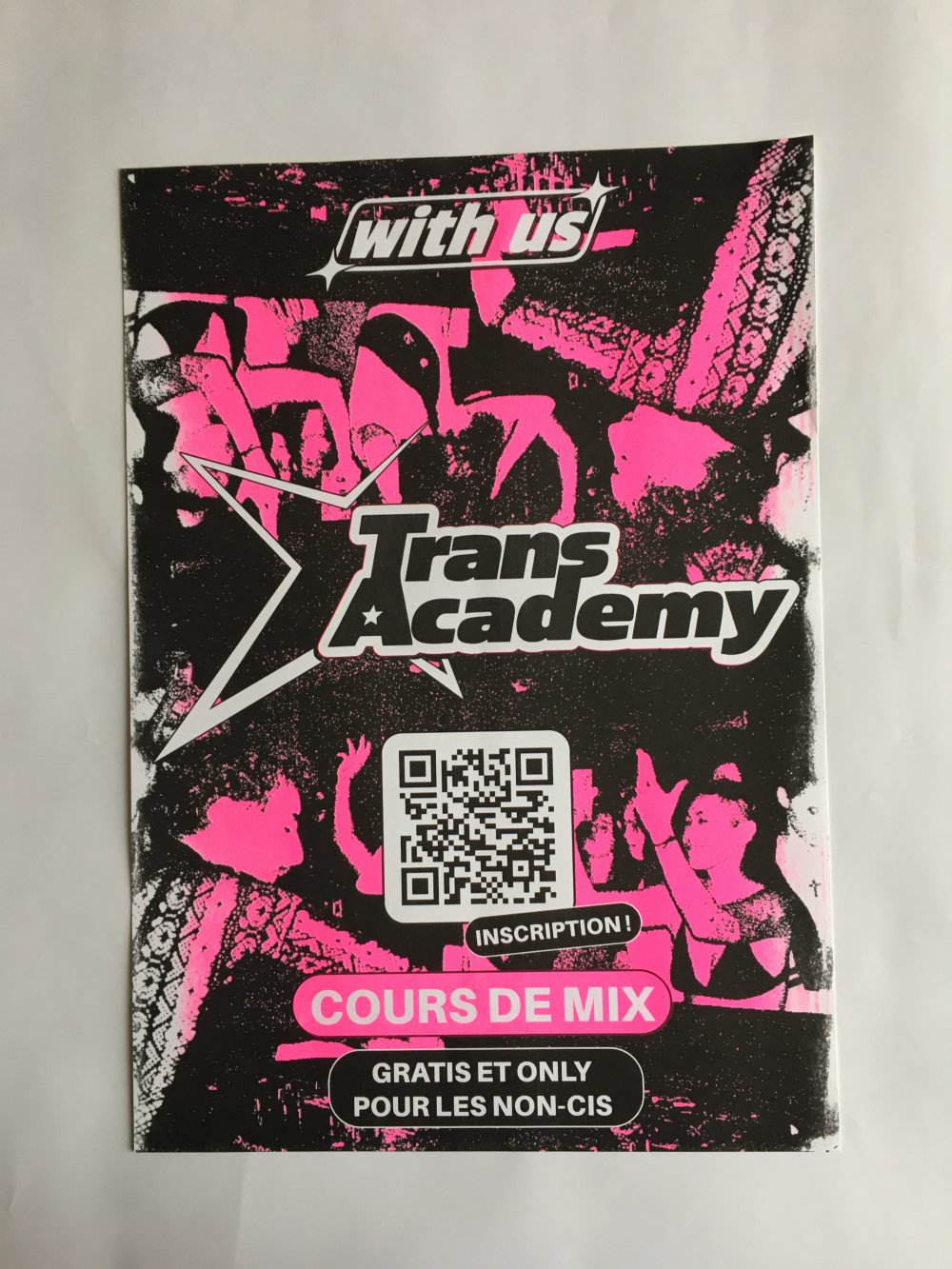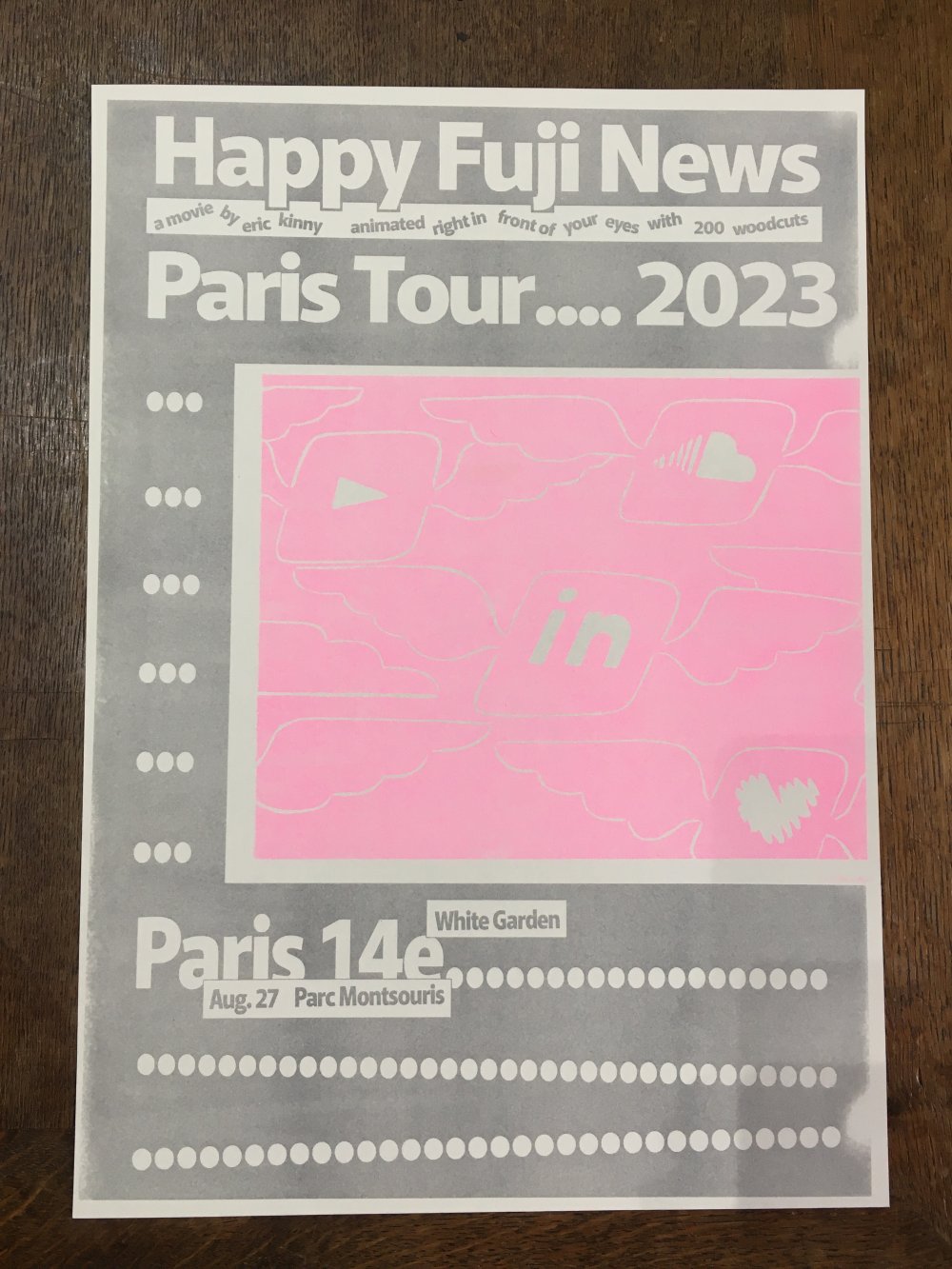 Affiche riso A3, trichromie jaune, rose fluo, jaune.