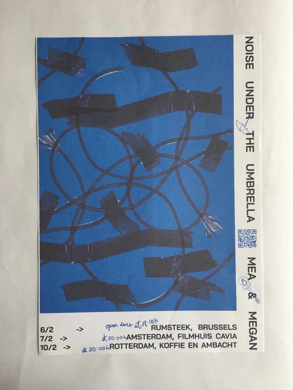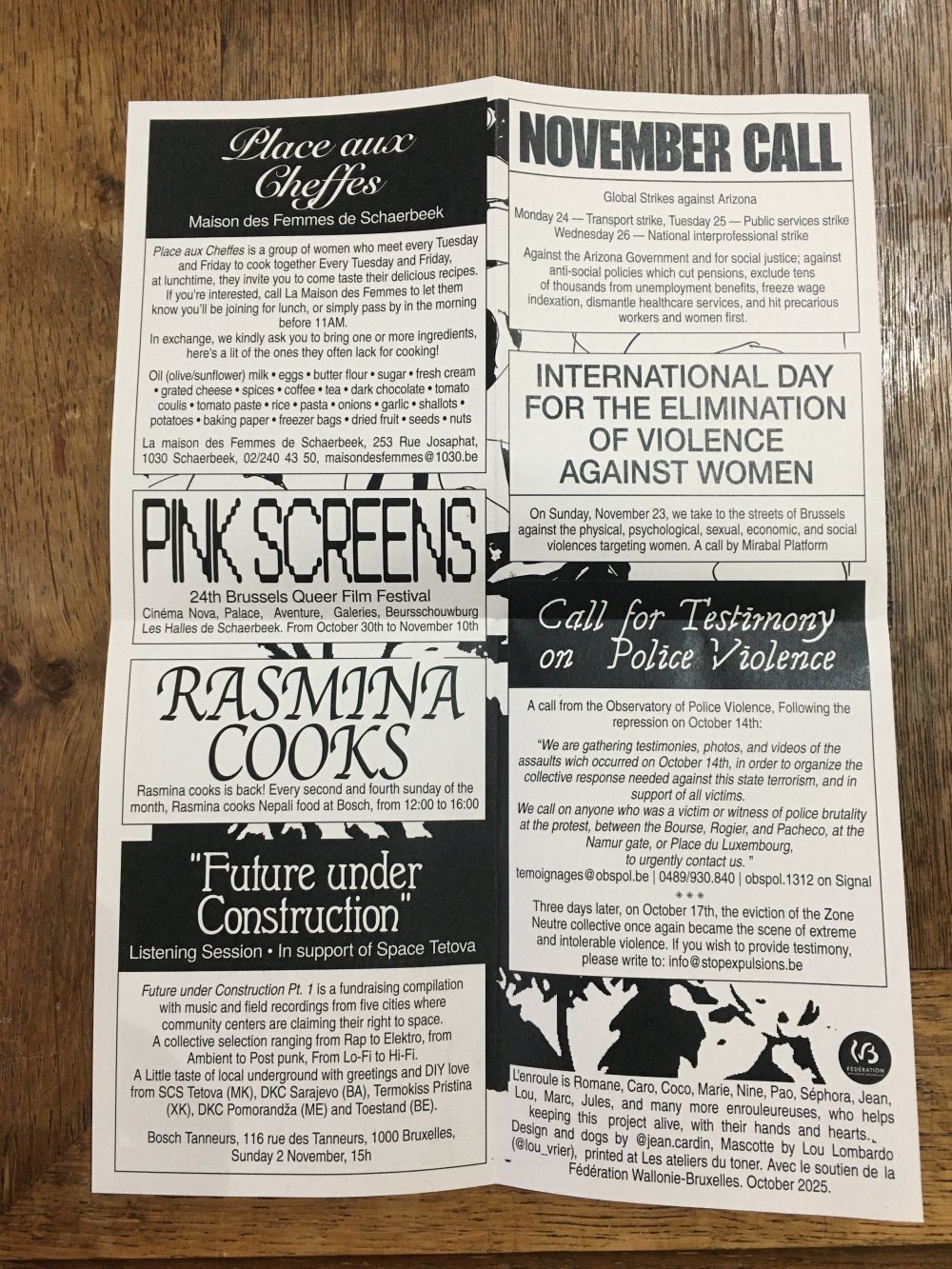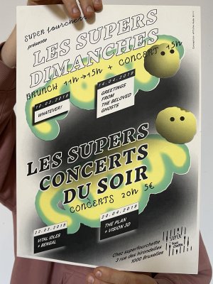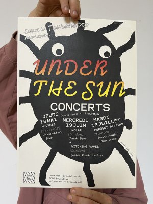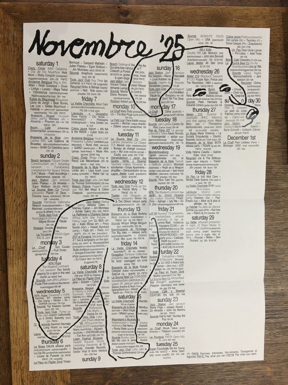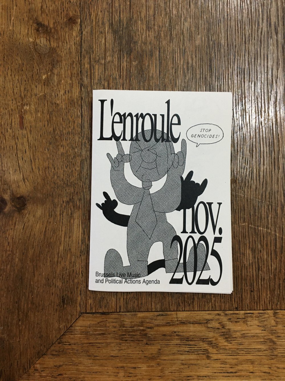 L'enroule est un agenda mensuel de musique live et de luttes à bruxelles, since 2023, A3 recto verso plié en 3 pour donner un petit fanzine A6. impression laser noir et blanc.