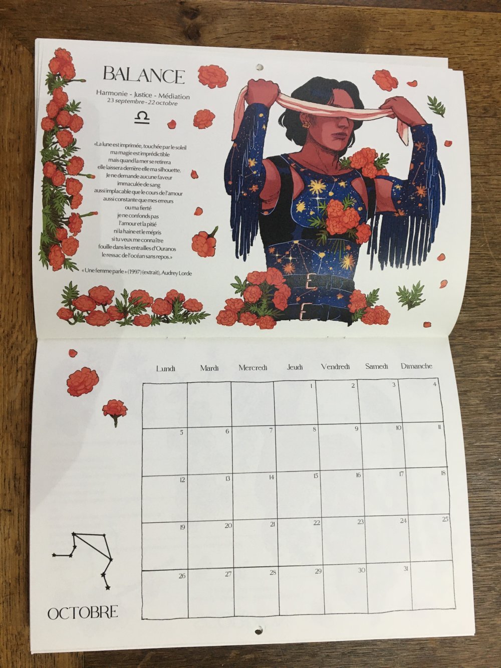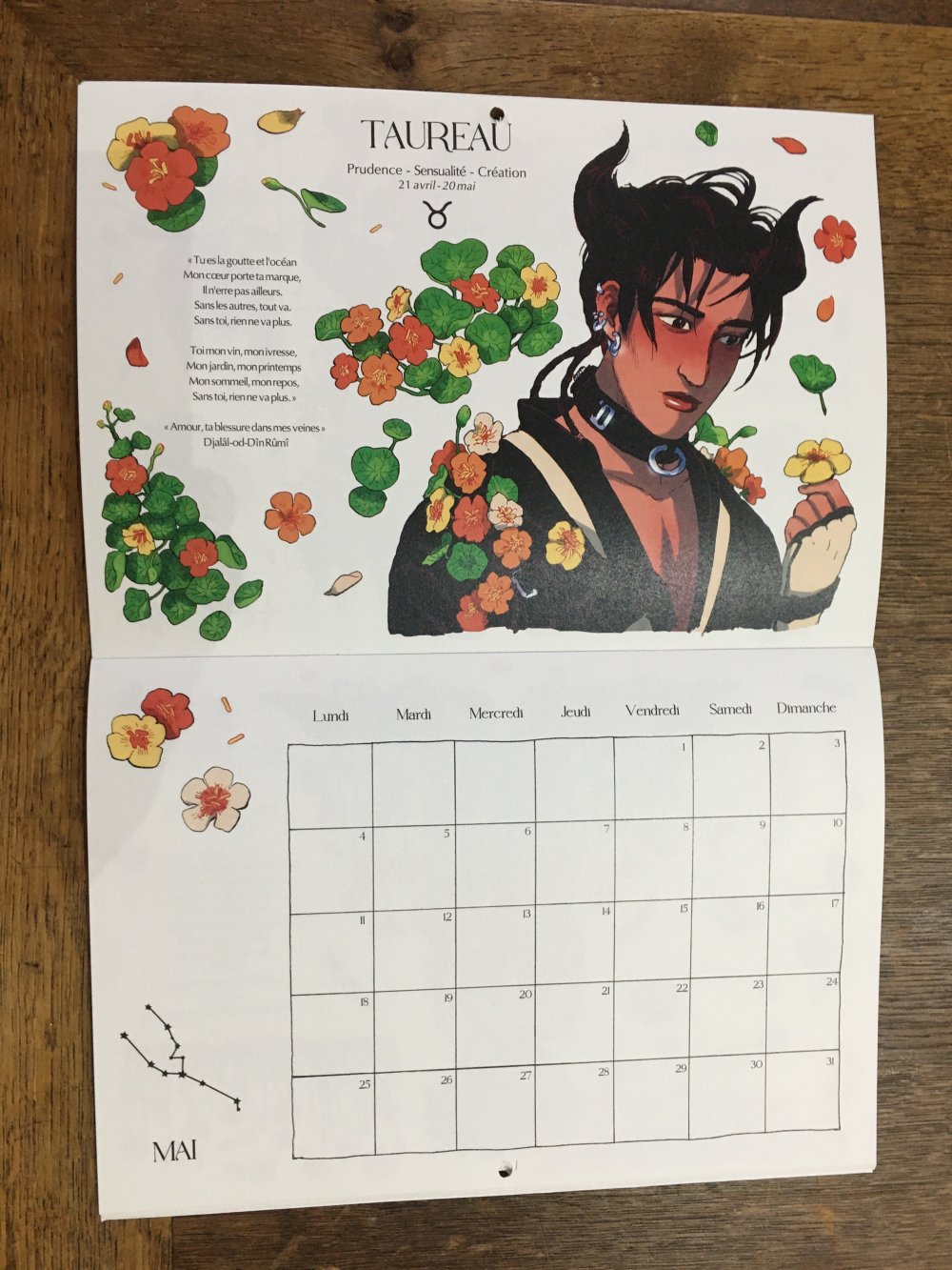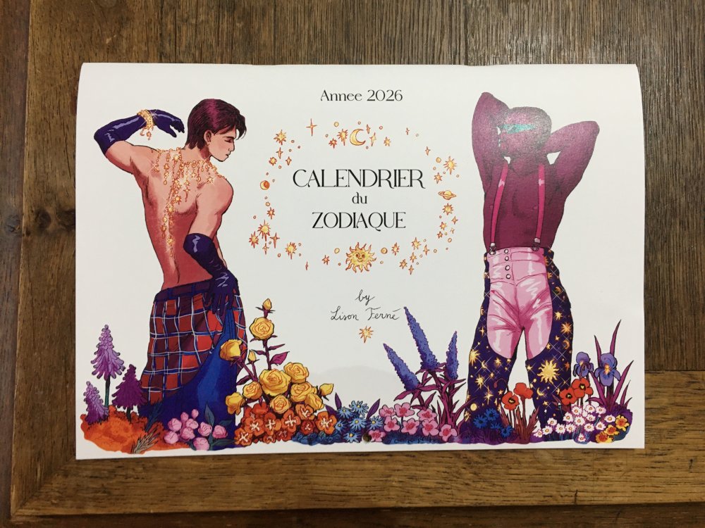 Un calendrier 2026 qui met en valeur les signes astrologiques, accompagnés à chaque mois par un poème soignesement récoluté.