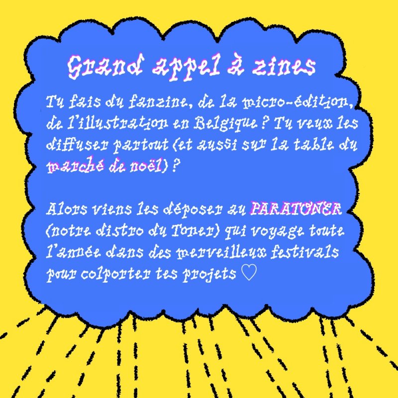 Alors viens les déposer au Paratoner, notre distro du Toner qui voyage toute l'année dans des merveilleux festivals pour colporter tes projets ♡